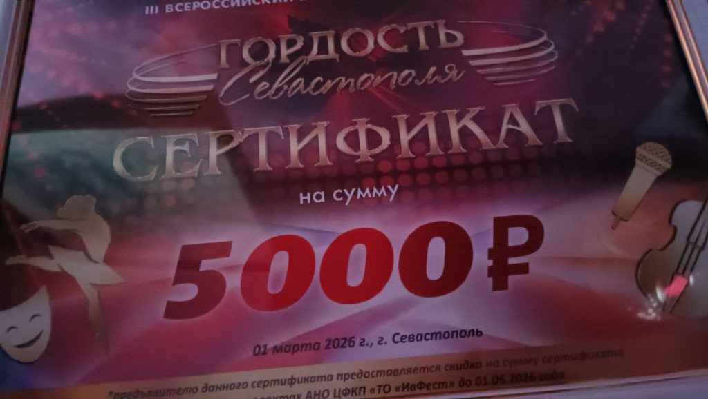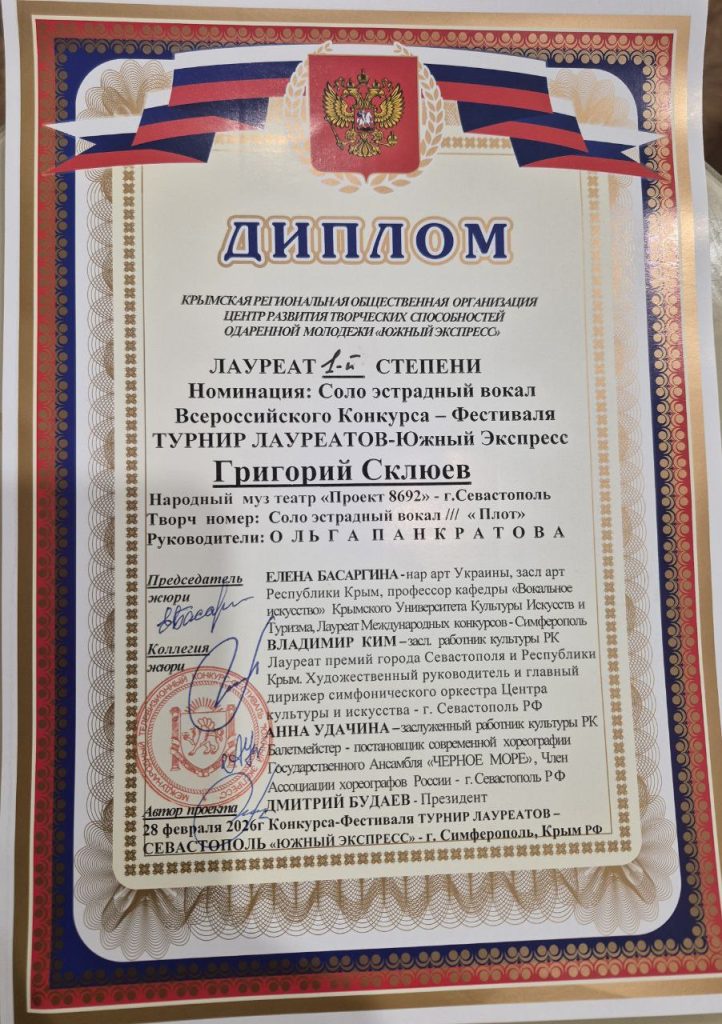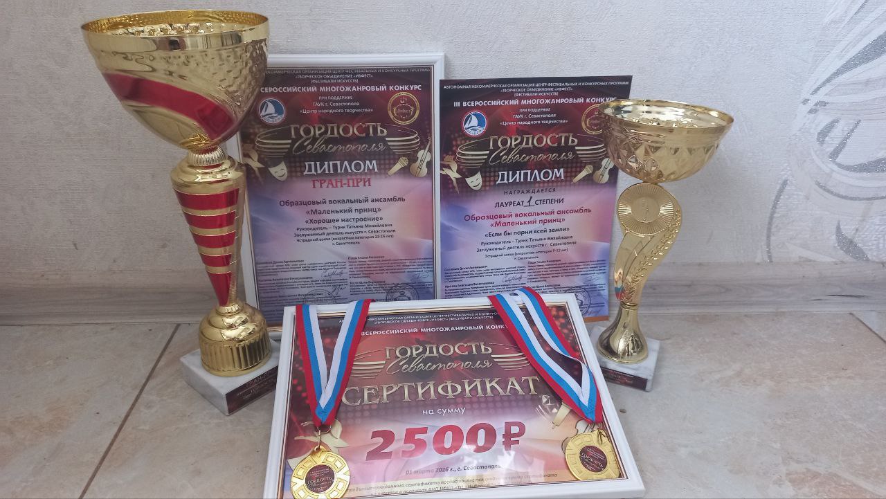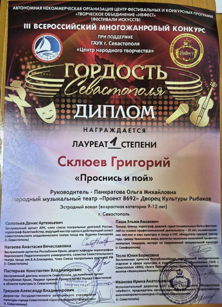 Гран – при завоевал и  образцовый вокальный ансамбль «Маленький принц» в номинации «Эстрадный вокал» и  музыкальная композиции «Если бы парни всей земли..» в исполнении юных артистов удостоена Диплома лауреатов 1 степени. Руководитель —  заслуженный деятель искусств Севастополя Татьяна Михайловна Турик.Опыт выступления на большой сцене  воспитанника заслуженной артистки России Ольги Панкратовой, высокий уровень исполнительского мастерства помог   юному солисту  музыкального театра «Проект 8692»  Григорию Склюеву  чувствовать себя уверенно среди конкурсантов на III Всероссийском многожанровом конкурсе «Гордость Севастополя» и Всероссийском конкурсе-фестивале «Турнир лауреатов. Южный экспресс» и стать обладателем Дипломов лауреата 1-й степени  в номинации «Эстрадный вокал».