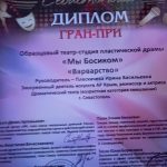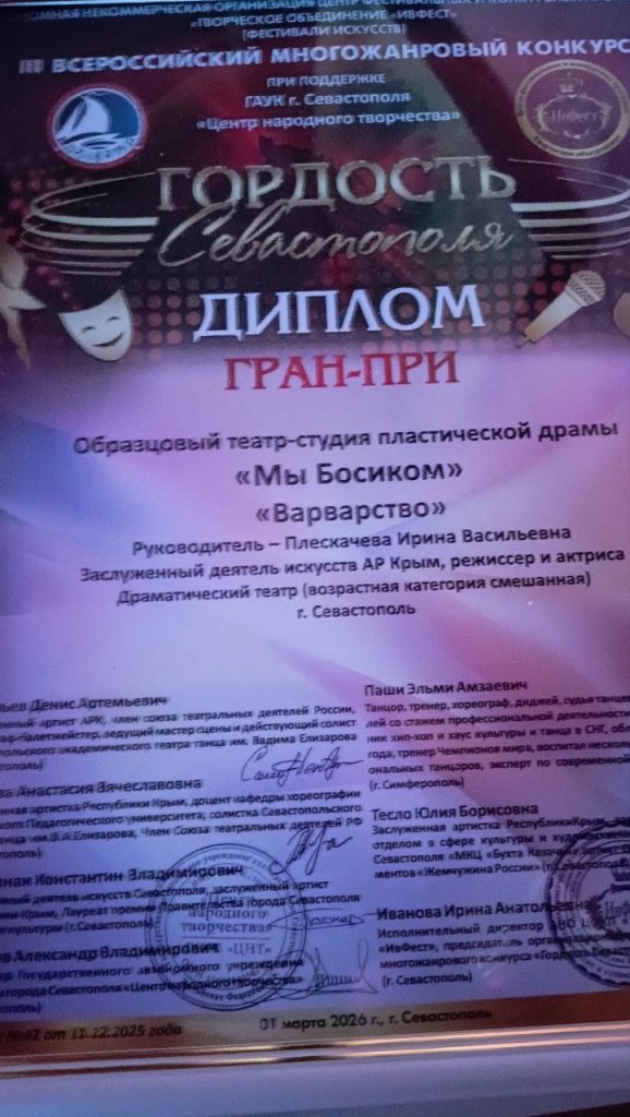 Поздравляем воспитанников образцового театра — студии пластической драмы «Мы босиком» и руководителя коллектива — Заслуженного деятеля искусств Республики Крым  Ирину Васильевну Плескачёву  с  победой  на  III Всероссийском многожанровом конкурсе «Гордость Севастополя». В номинации «Драматический театр»  наш коллектив  был отмечен жюри  наивысшей наградой — Гран — при конкурса!
