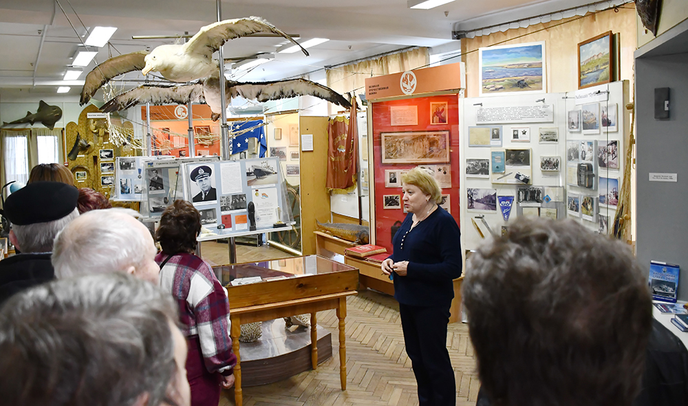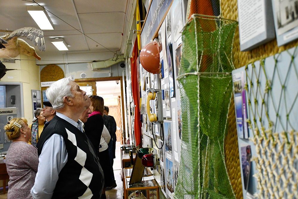 С интересом слушали посетители музея о легендарном Петре Ивановиче Котко, председателе колхоза «Рыбацкая коммуна», который располагался на Северной стороне. В условиях осады и бомбежек остро встал вопрос продовольственного снабжения. Рыбаки возобновили промысел, несмотря на трудности: нехватку опытных моряков, необходимость ремонтировать старые суда, опасность боевых действий. Женщины и подростки осваивали рыбацкое дело, работая по 16-18 часов в сутки. Рыбаки снабжали рыбой армию, флот и население, проявляя самоотверженность и трудовую доблесть.