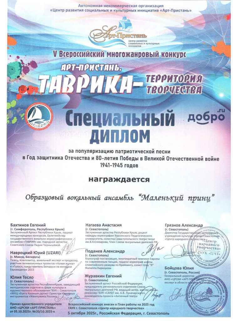Юные артисты образцового вокального ансамбля «Маленький принц» Дворца культуры рыбаков стали обладателями Дипломов лауреатов I степени  V Всероссийского многожанрового конкурса  «АРТ-пристань. Таврика — территория творчества» , который проходил 5 октября в Севастополе на сцене  драматического театра ЧФ  РФ имени Бориса Лавренёва. Руководителю ансамбля- заслуженному деятелю искусств Севастополя Т.М.Турик был вручен Специальный диплом » За популяризацию патриотической песни в Год защитника Отечества и 80-летия Победы в Великой Отечественной войне 1941 -1945 г.г.»