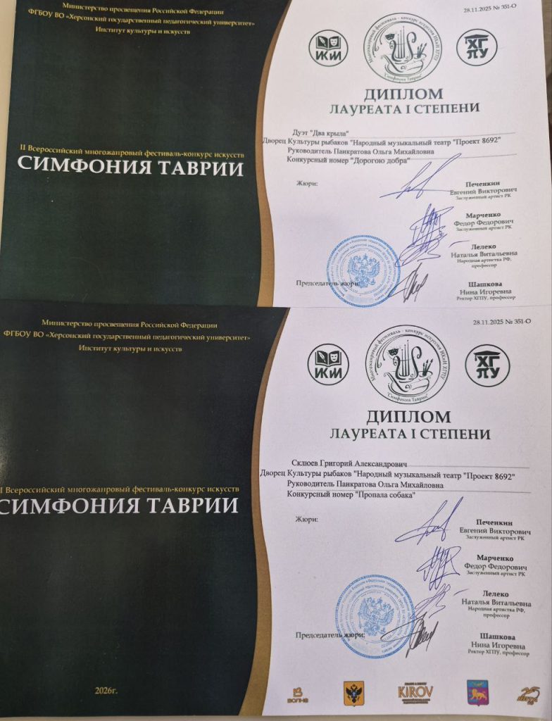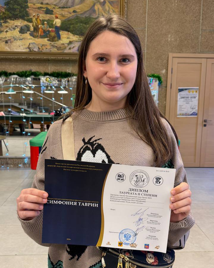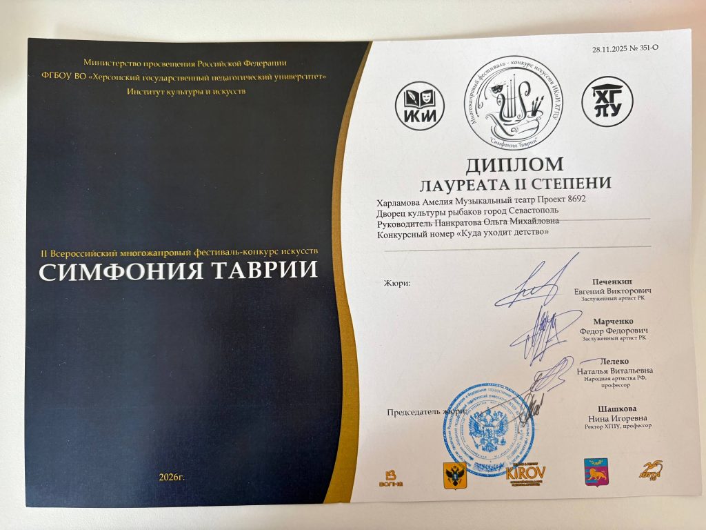 Наши талантливые ребята  Григорий и Владимир Склюевы,  Амелия Харламова, участники музыкального театра «Проект 8692»  (руководитель — заслуженная артистка России Ольга Панкратова) успешно выступили на  Всероссийском фестивале-конкурсе «Симфония Таврии»(г.Ялта). Поздравляем юных артистов с достойным выступлением! Желаем дальнейших творческих успехов, чтобы ваши  старания и   упорный труд обязательно приводили  к призовым местам и заслуженным наградам! Молодцы! Гордимся вами!