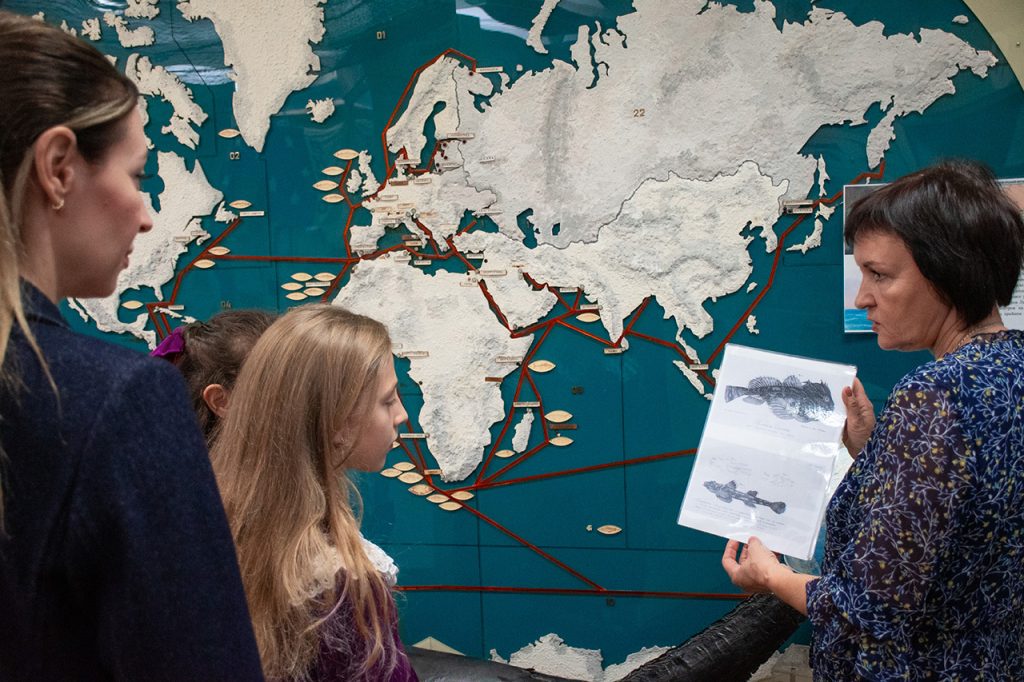 Вниманию посетителей музея был предложен иллюстративный материал  из «Атласа к путешествию вокруг света капитана Крузенштерна».  Обсуждая влияния научных  открытий И.Ф.Крузенштерна на развитие мореплавания, Тамара Викторовна подчеркнула, что труды великого адмирала по-прежнему остаются фундаментальными для мировой географии, а его имя по праву носит один из крупнейших учебных  парусников  в мире.