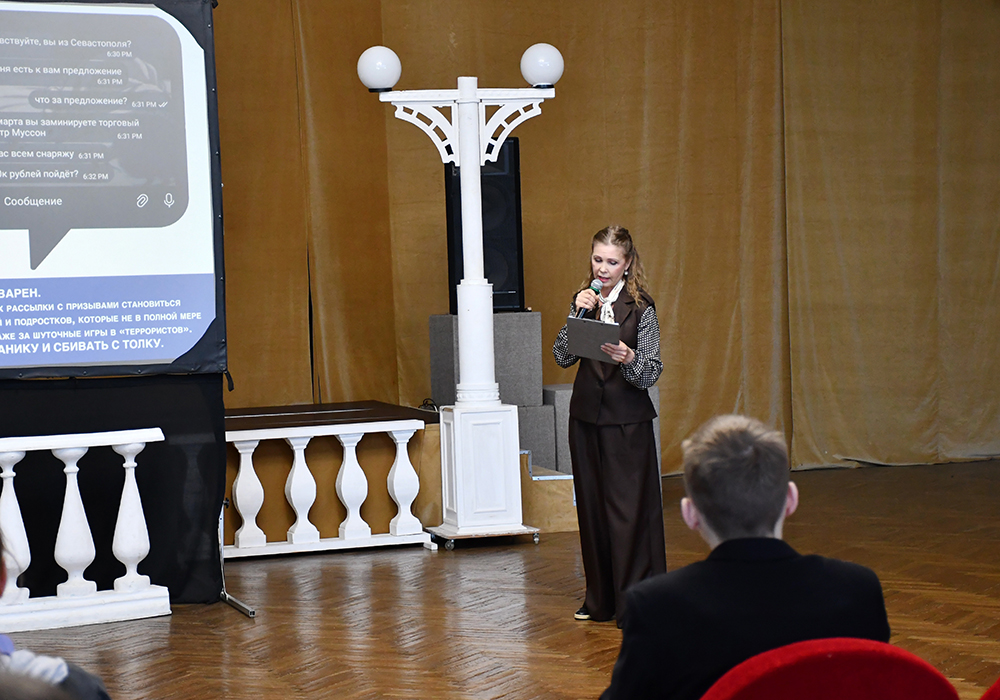 В ходе встречи спикер Инна Цыбина, заслуженный работник культуры Севастополя, затронула такие важные темы, как способы распознавания пропаганды радикальных идей и механизмы вовлечения молодёжи в деструктивные группы. Обсудили и роль критического мышления при оценке информации из интернета или социальных сетей, а также значение традиционных ценностей, патриотизма и единства общества. Особое внимание уделялось ответственности ребят за собственный выбор и необходимости своевременного обращения за помощью к компетентным органам  в случае возникновения подозрительных ситуаций.